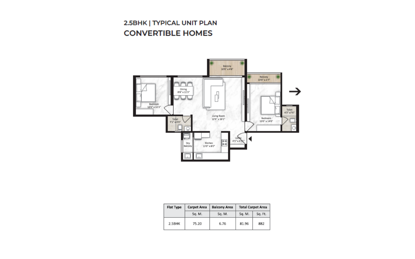 | 2.5 BHK | Apartment | ₹1 crore | 3 | 2 | 882 sqft | |